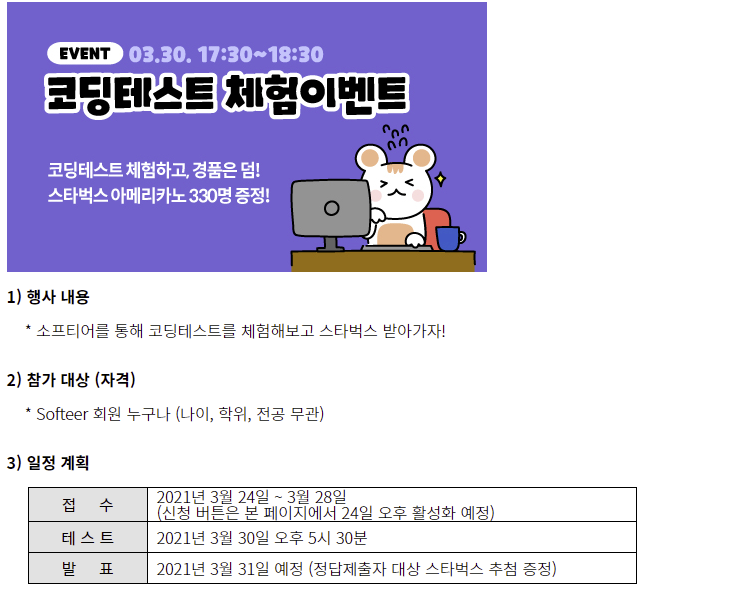 런칭 기념으로 코딩테스트 체험이벤트를 개최하였고 참여해 볼 수 있었다.