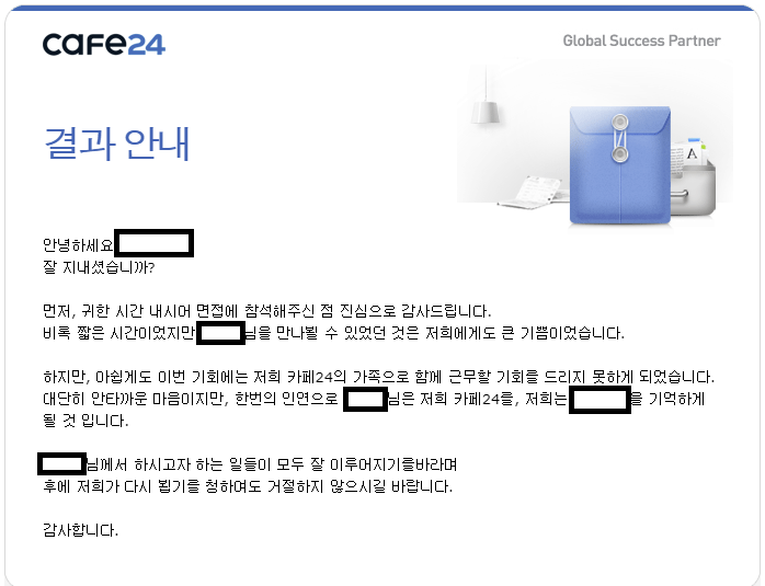 카페 24에서 유선으로 연락을 주었고, 일정을 잡았다. 면접을 보기전에 간단하게 1장 정도의 자기소개서를 써달라고 했고, 지원동기와 성격의 장단점을 작성하여 제출했다.